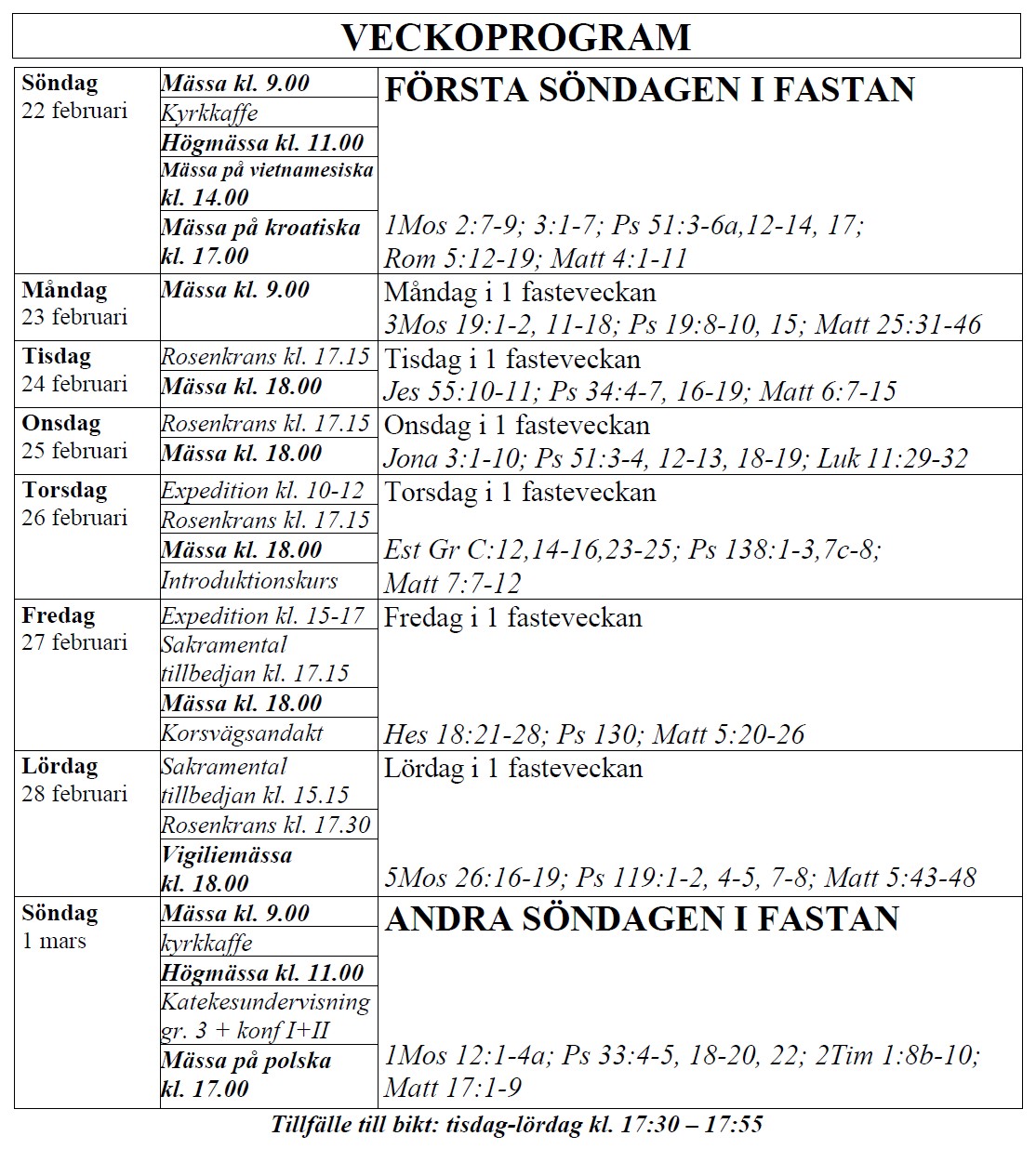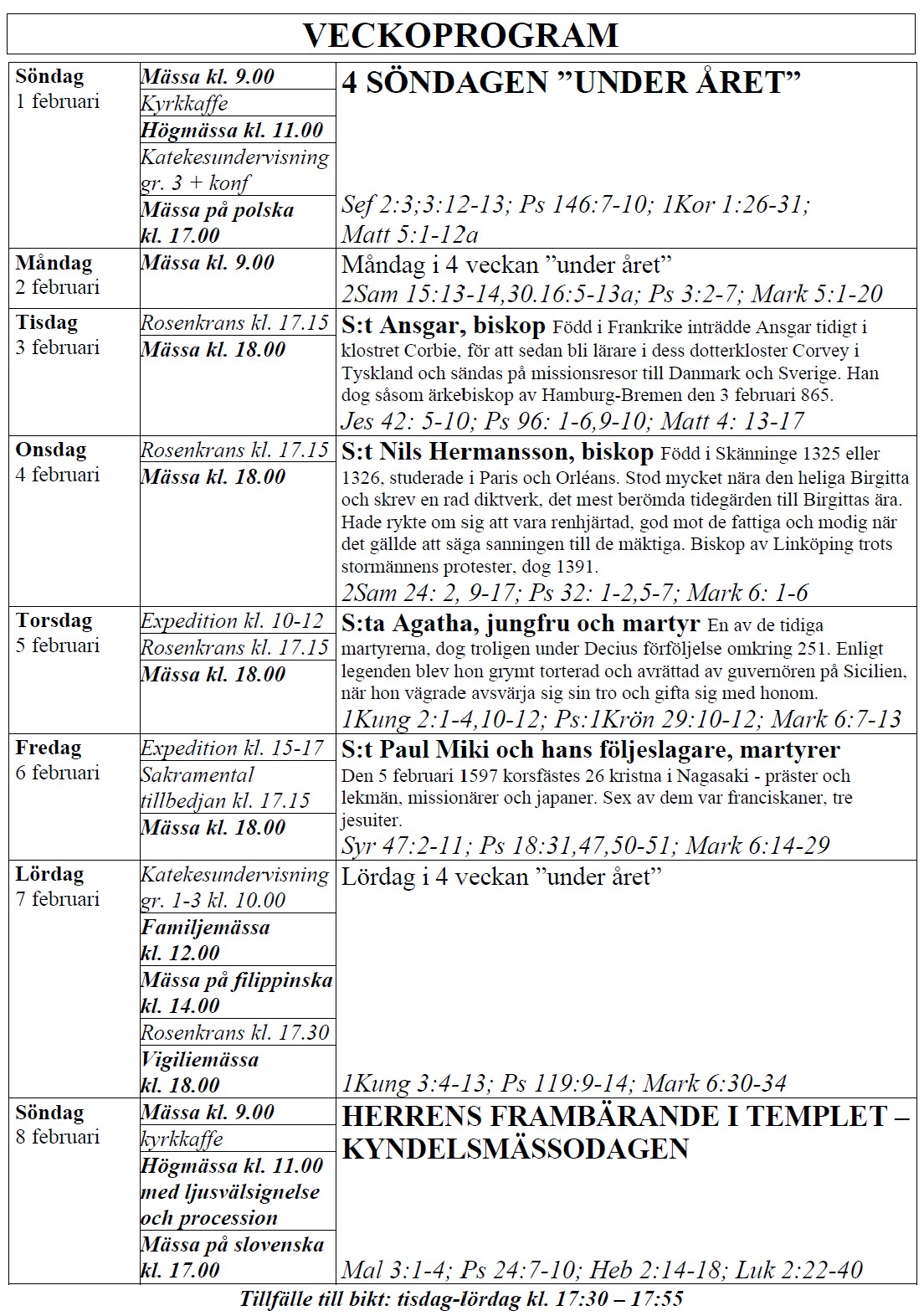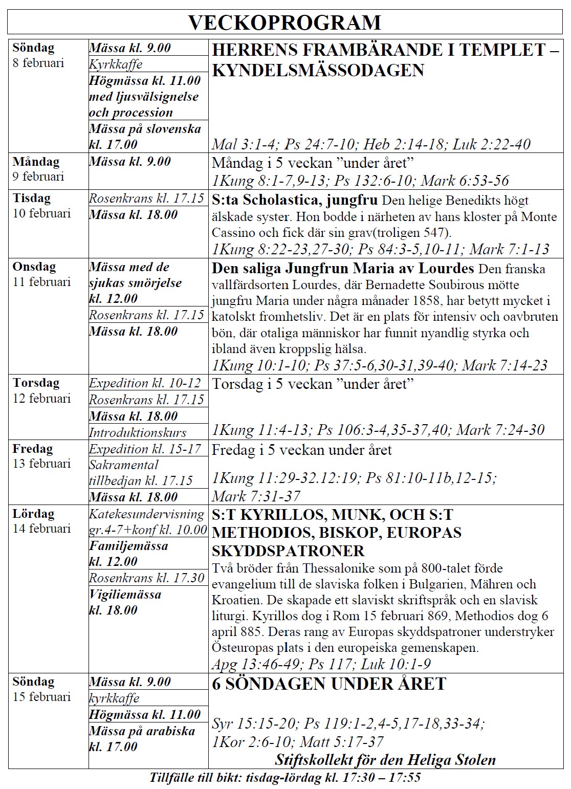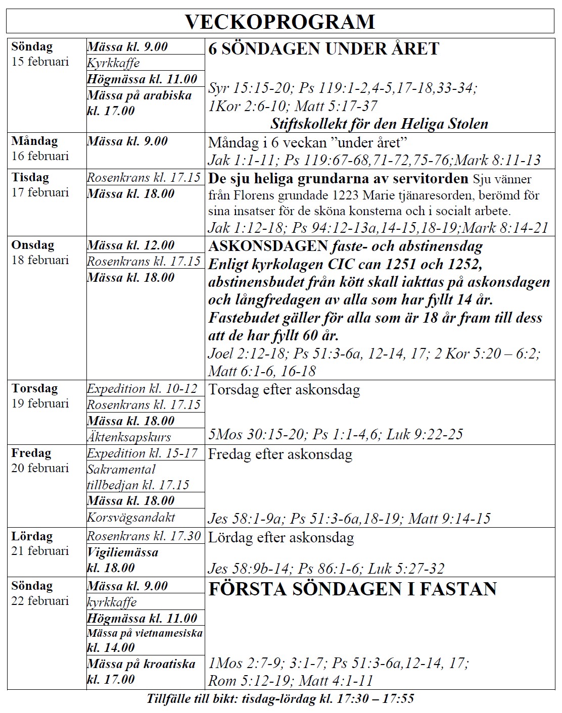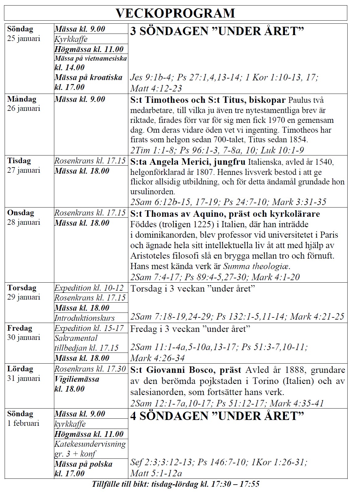 själasörjarna firar heliga Mässor på följande tider (september-juni):