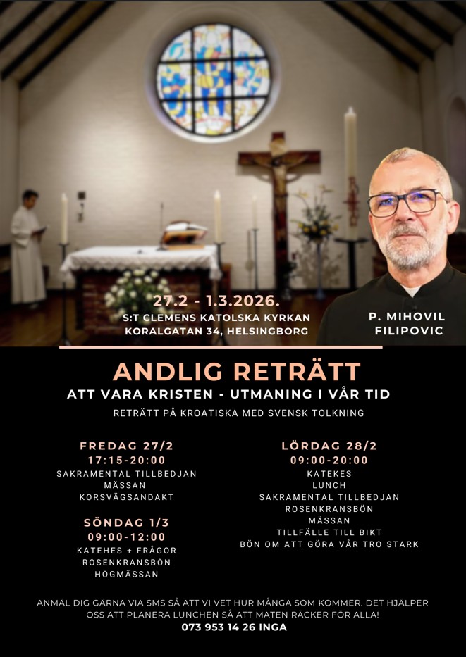Reträtten hålls på kroatiska med tolkning till svenska. Gudstjänster under reträtten firas på svenska och latin som en del av ordinarie församlingsliv.