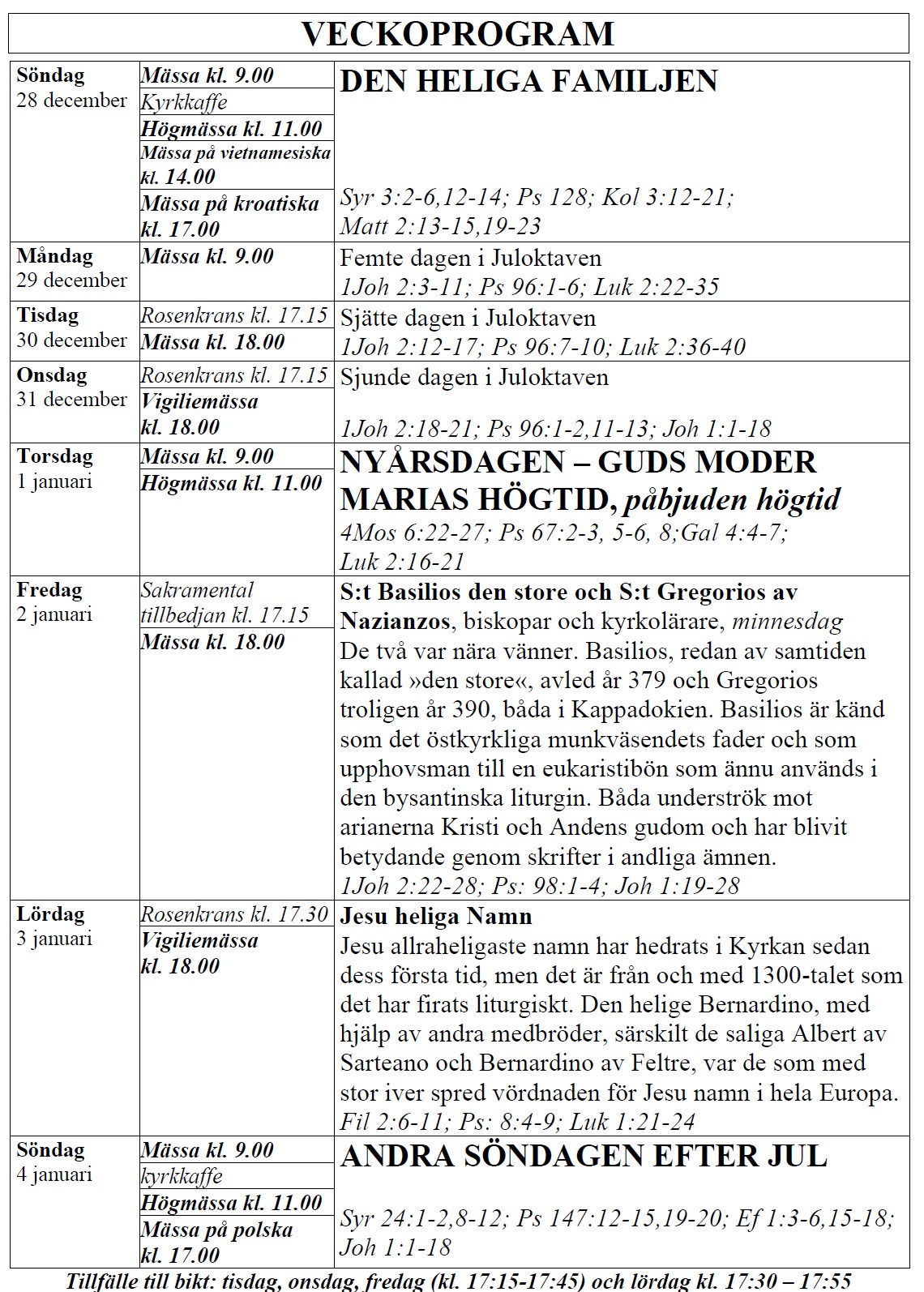 lördag – Vigiliemässa kl. 18.00