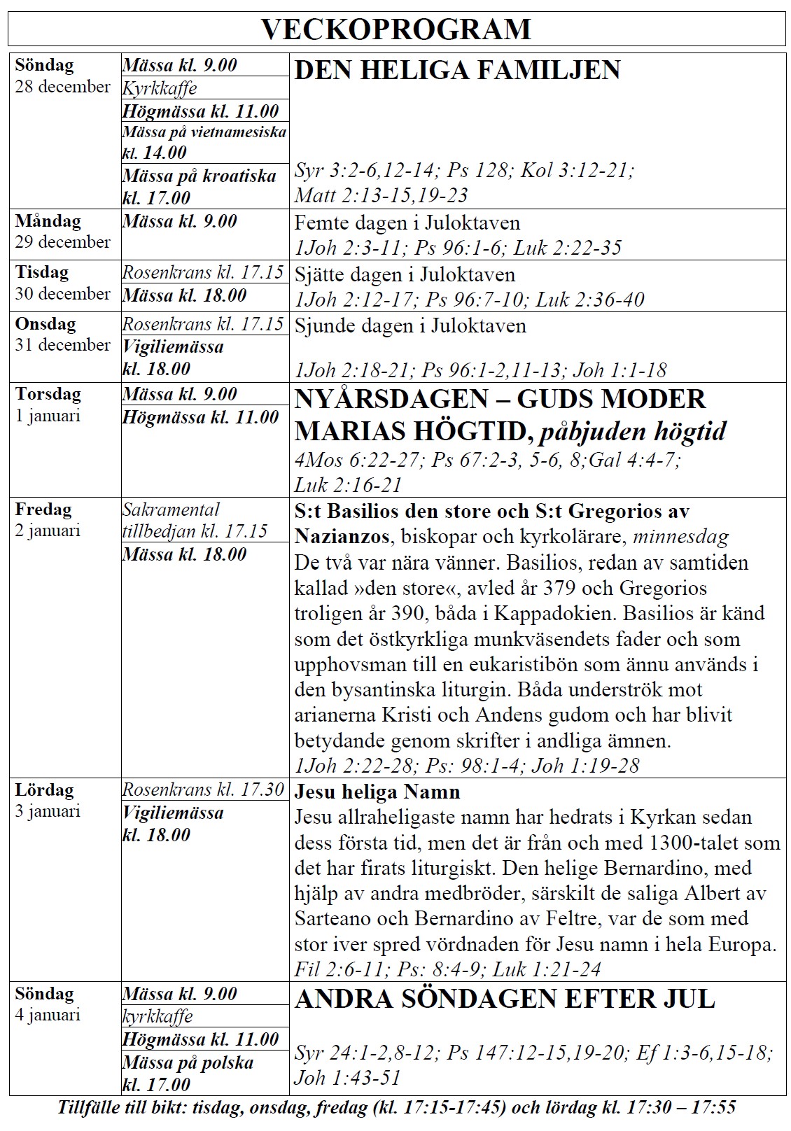 själasörjarna firar heliga Mässor på följande tider (september-juni):