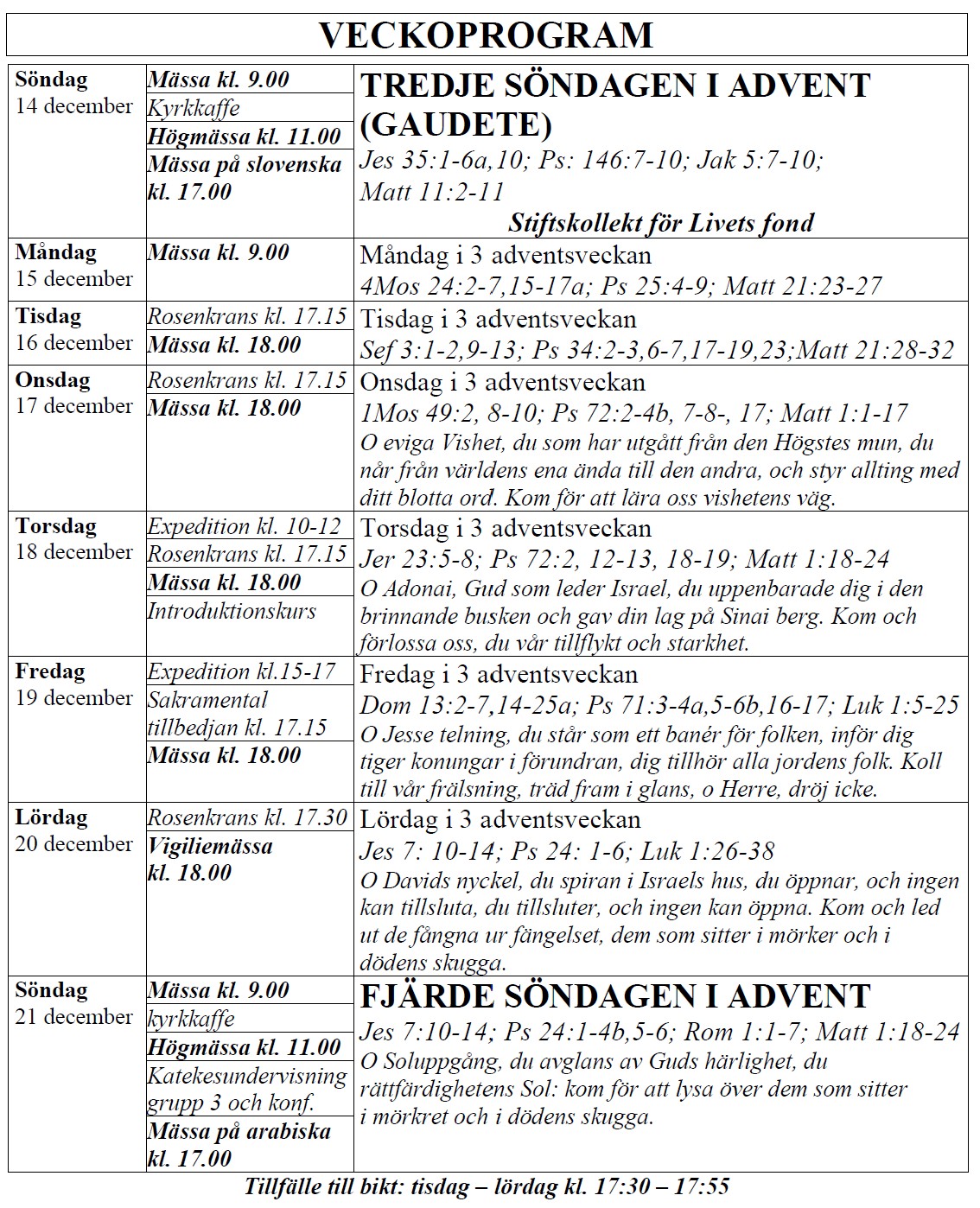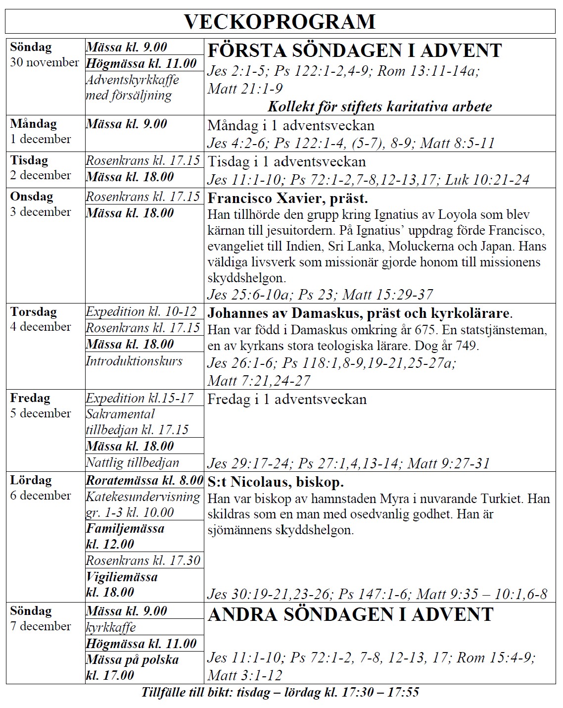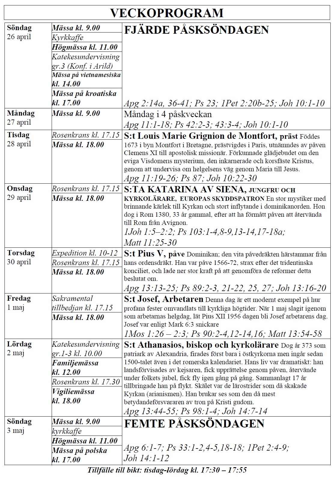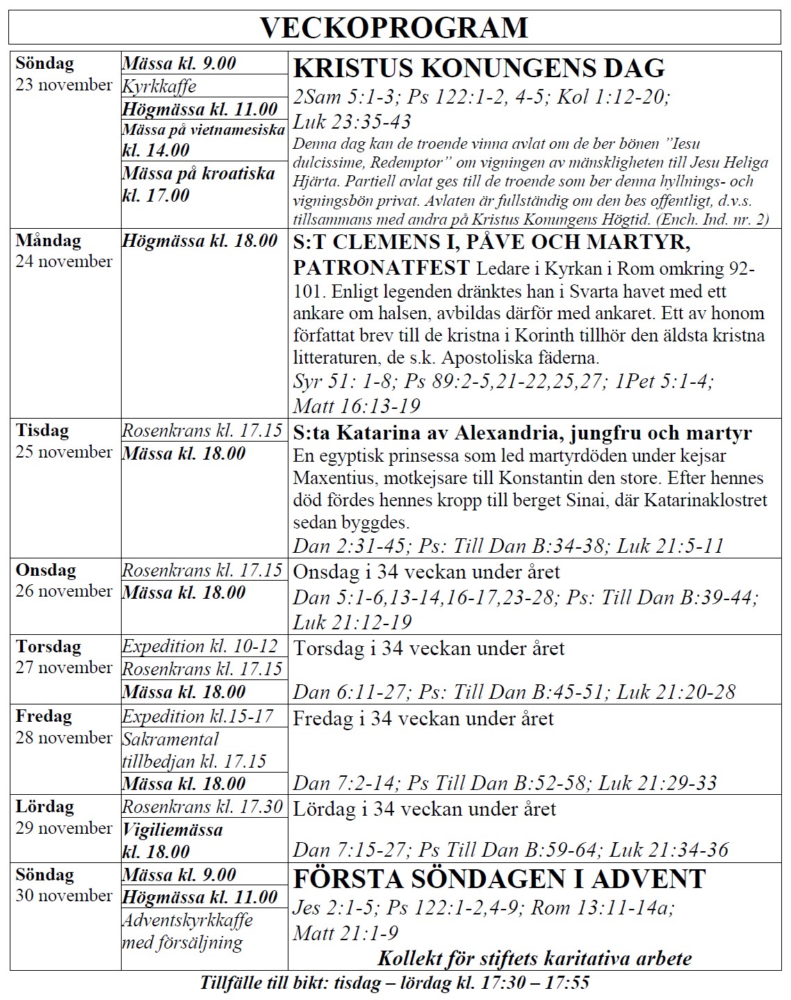 själasörjarna firar heliga Mässor på följande tider (september-juni):