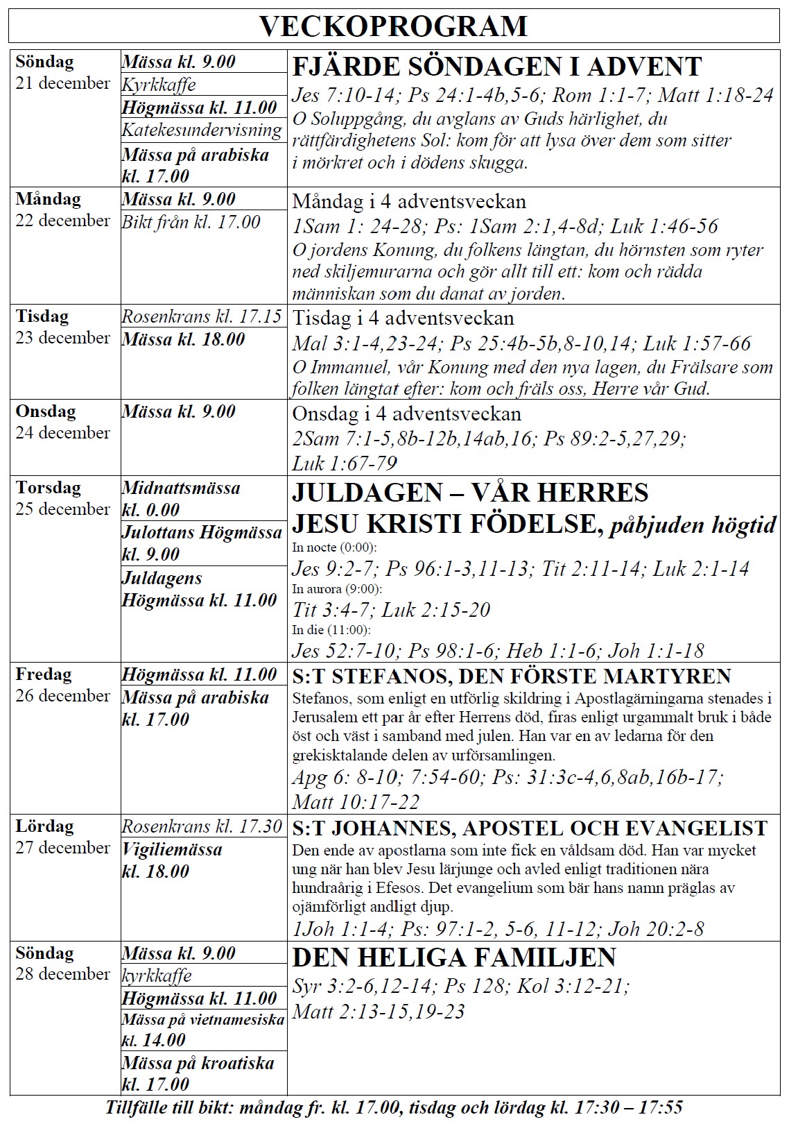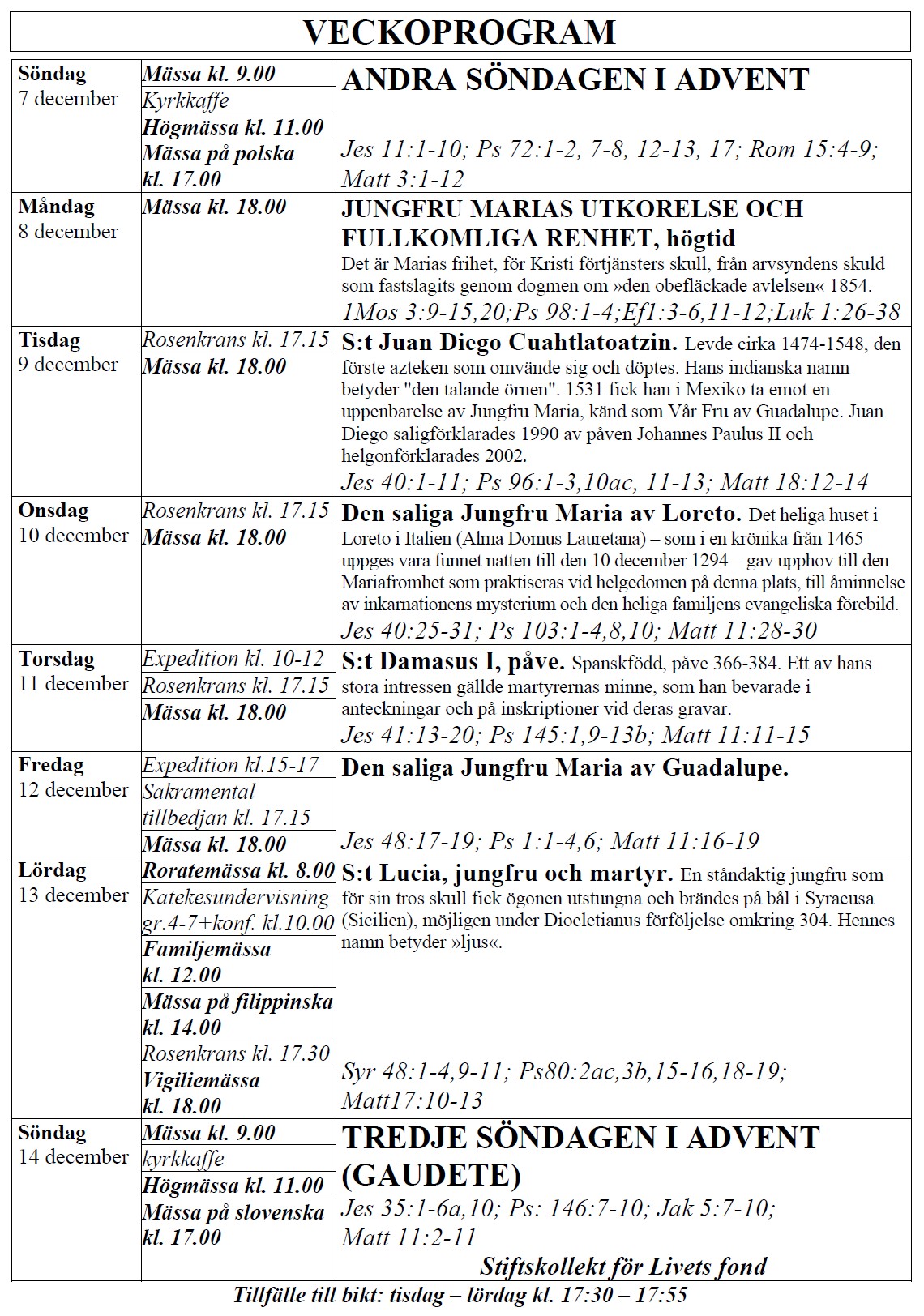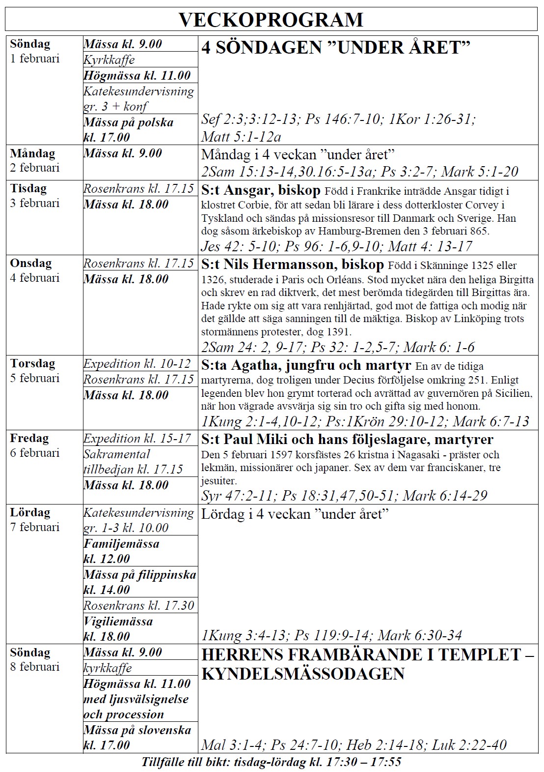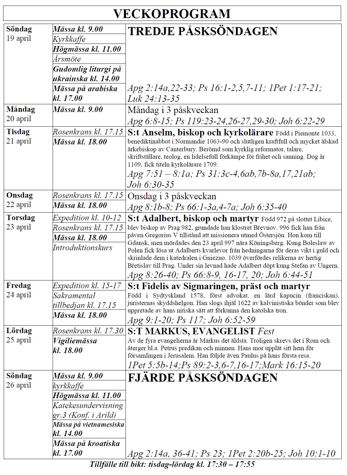 själasörjarna firar heliga Mässor på följande tider (september-juni):
