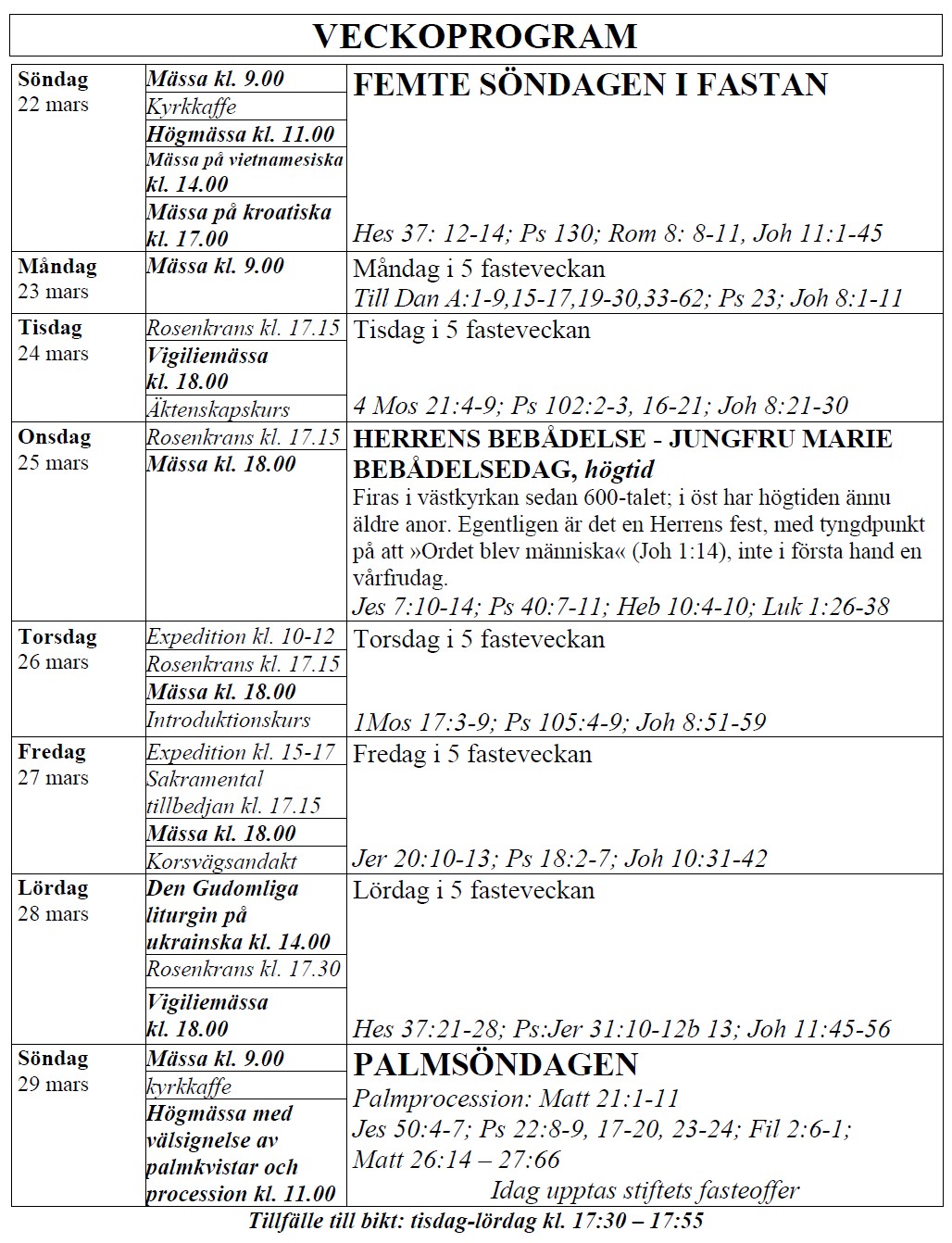 För avvikande tider kontakta systrarna genom www.karmel.se